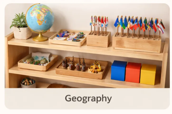 Culture is integrated, not “a unit”: Montessori connects geography to people, language, traditions, and history—so students develop respect and global awareness, not trivia.
